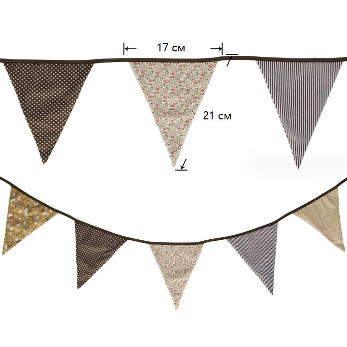 Гирлянда состоит из 12 флажков. Расстояние между флажками - 6 см, общая длина составляет 4 м.