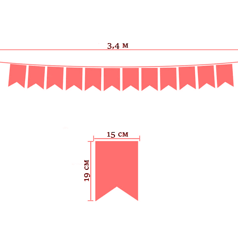 Гирлянда состоит из 12 флажков, общая длина составляет 3,4 м, расстояние между флажками 3 см, длина матерчатых флажков 2,1 м, длина лямок с обеих сторон по 50 см