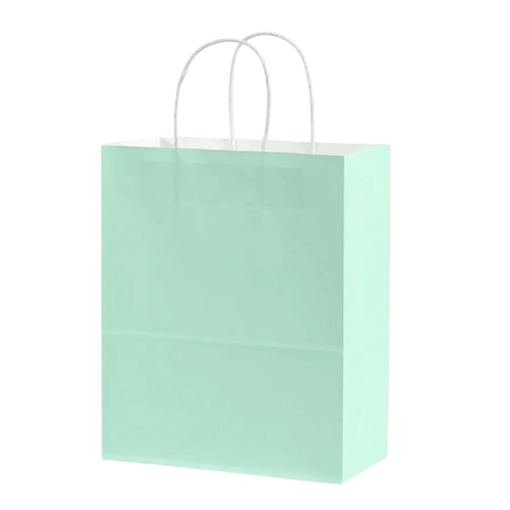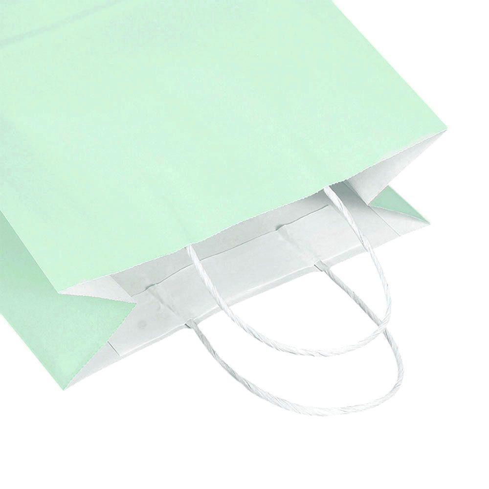 Подарочный пакет из крафтовой бумаги пастельного оттенка с белыми бумажными ручками и белой внутренней стороной.